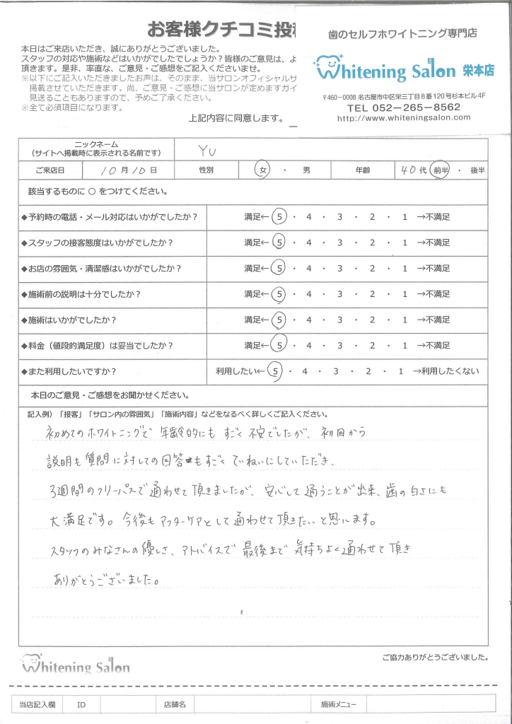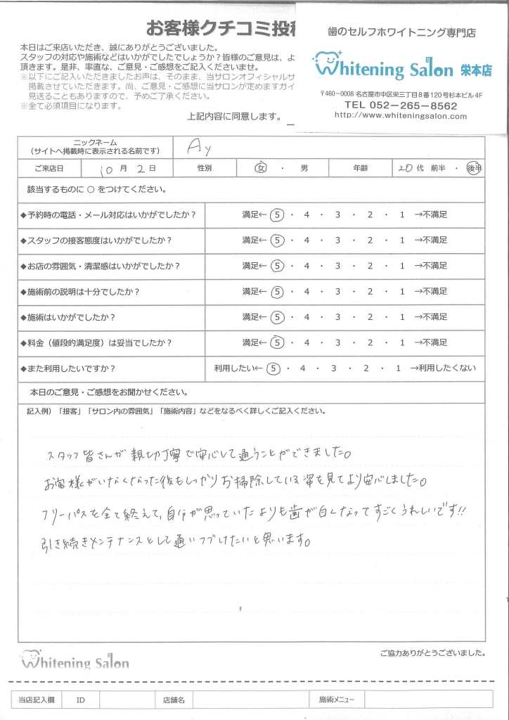 3週間のフリーパスで通わせて頂きましたが、安心して通うことが出来、歯の白さにも