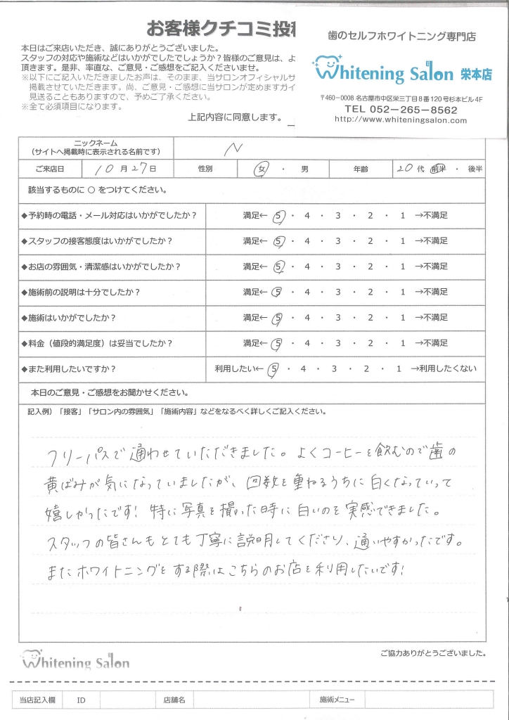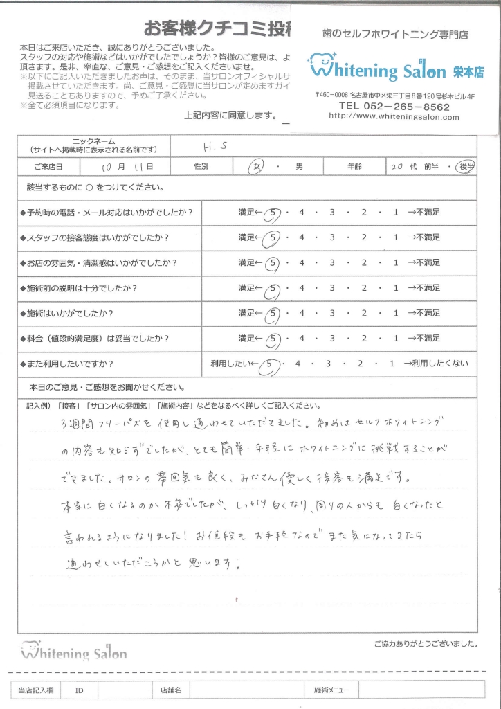 3週間フリーパスを使用し通わせていただきました。初めはセルフホワイトニング