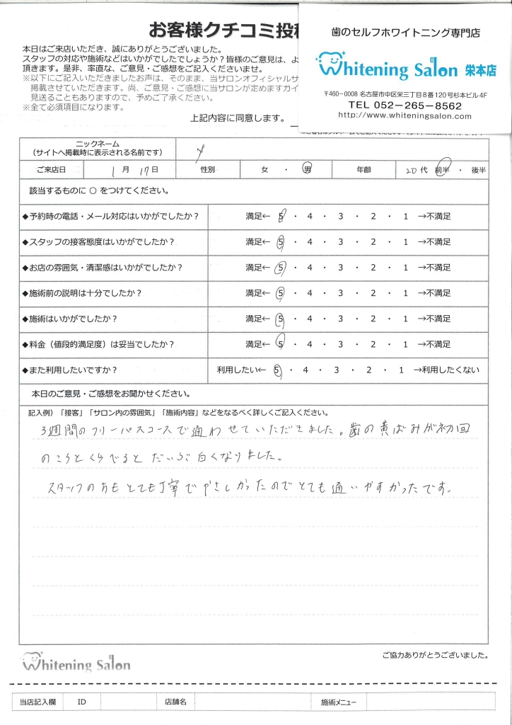 3週間のフリーパスコースで通わせていただきました。歯の黄ばみが初回