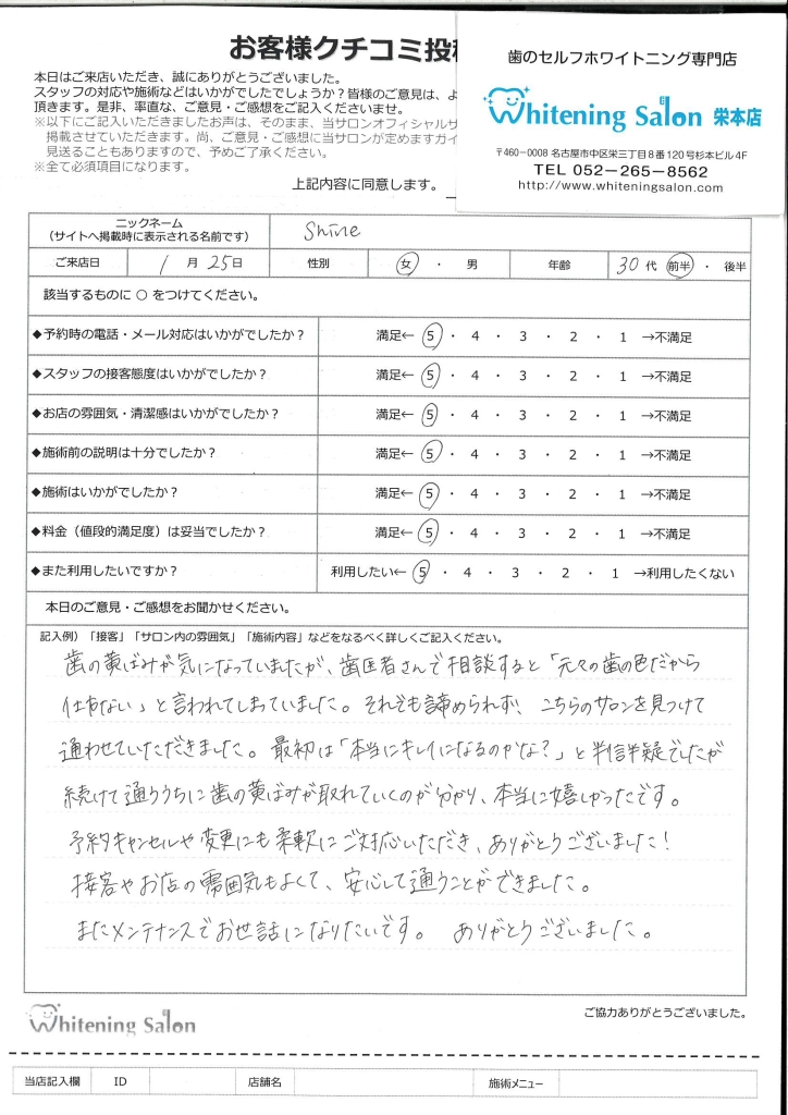 続けて通ううちに歯の黄ばみが取れていくのが分かり、本当に嬉しかったです。