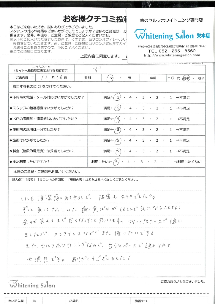 3週間のフリーパスコースで通わせていただきました。歯の黄ばみが初回